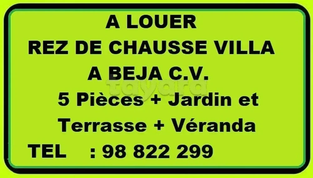 ☎ Tel 98822299 A louer Rez de chaussée villa pour habitation ✌🏠 ➡ Emplacement � �.: Centre ville Béja (cartier très calme Djebel lakhdar,) composée : ✅ d’un salon, ✅ 5 chambres , ✅ salle de bain et toilette, ✅ une cuisine . une courette (véranda ), un jardin. Loyer : 700 Dinars + 1 mois de cautionnement. ☎ Tel 98822299.